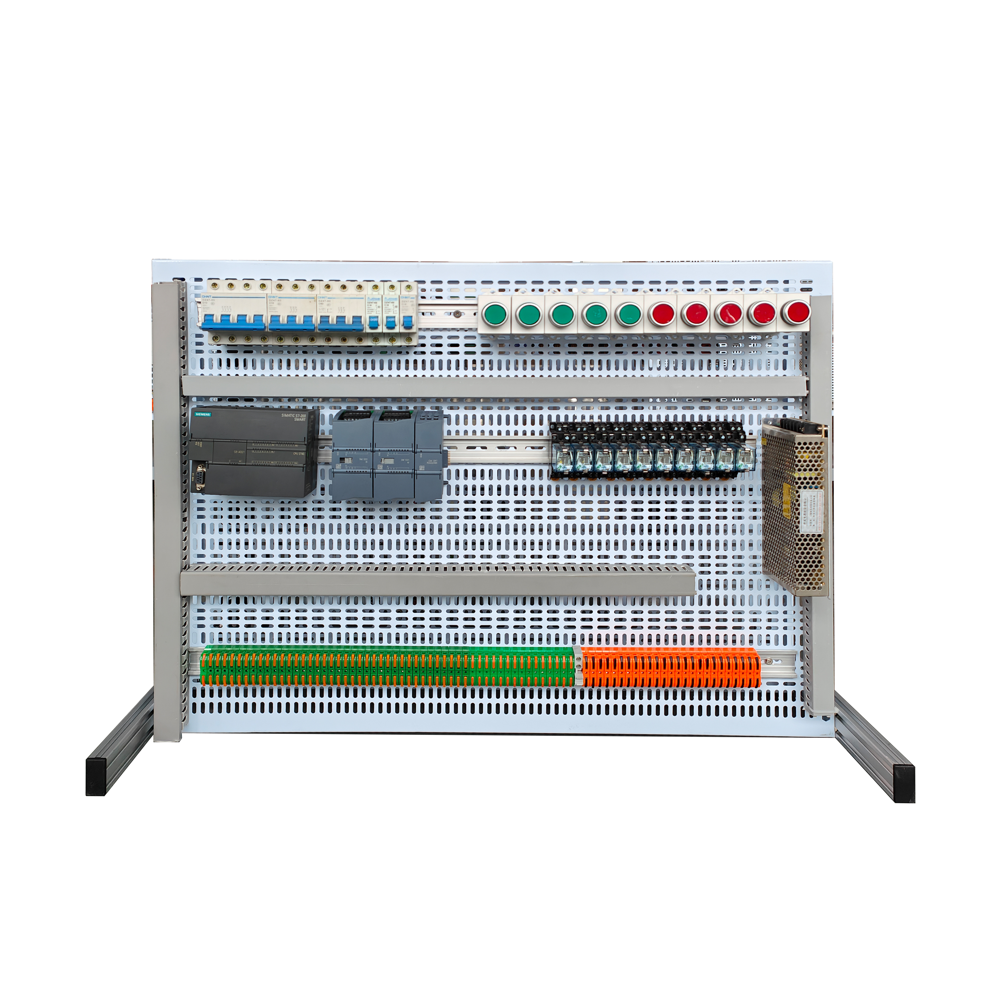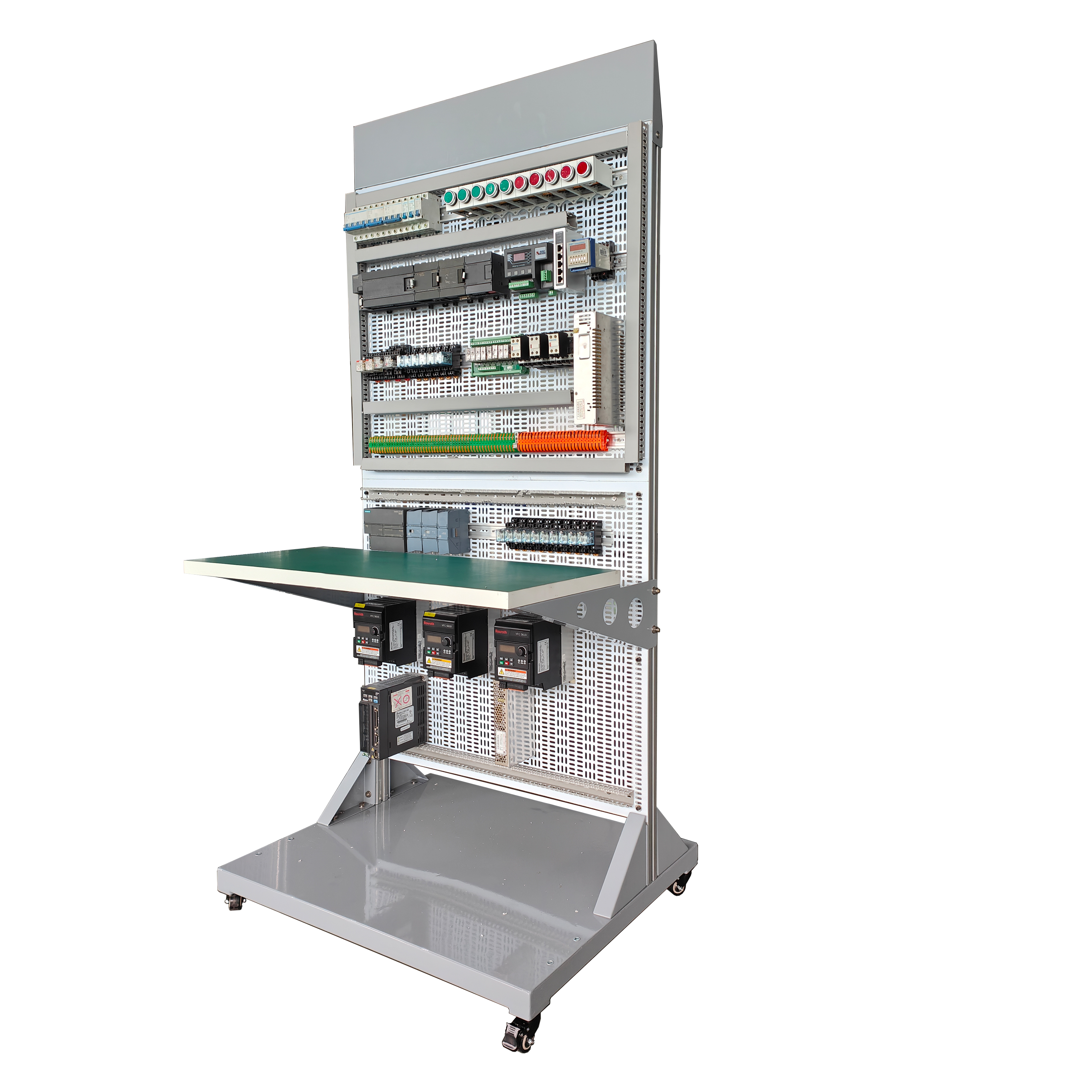 实训装置由控制屏、实训桌、主机实训组件、实训模块(含丰富的工业现场设备模拟实训对象)、变频器挂箱等组成。